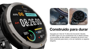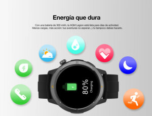 AGM Legion es un smartwatch resistente a golpes, polvo y agua sin perder su elegante diseño. Cuenta con certificaciones MIL-STD-810H y 5 ATM (resistencia al agua hasta 50 metros). Tiene una pantalla AMOLED de 1,43 pulgadas con 5 niveles de brillo ajustables que garantizan que su pantalla sea siempre perfectamente visible, adaptándose sin problemas a cualquier entorno. Permite realizar y recibir llamadas por bluetooth. Equipado con batería de larga duración de 300mAh. Monitoreo de salud: Frecuencia cardíaca, sueño, estrés y oxígeno en sangre. Multi-deportes (más de 100 actividades).